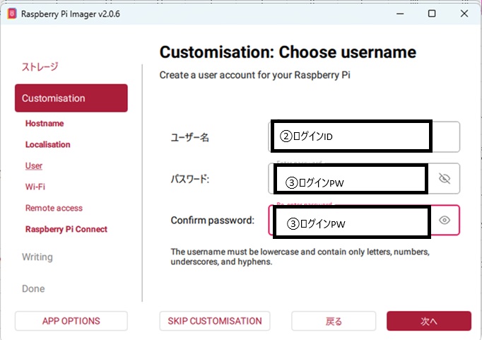 ②ログインID:Raspberry PiにログインするときのID。