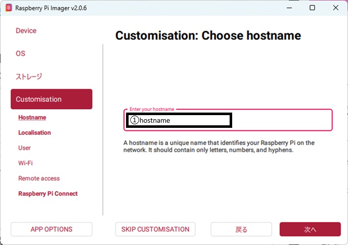 ①hostname:PCやiPad等からアクセスするのに使用する名前。