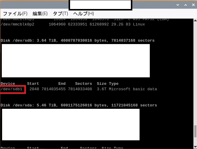 対象のHDDのDevice情報を確認(ここでは/dev/sdb1)