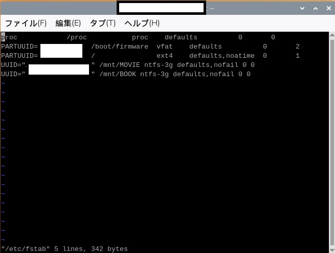 UUID=”↑で取得したUUID” ↑で作成したマウントパス ntfs-3g defaults, nofail 0 0