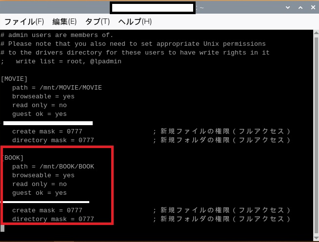 マウントしたHDDをsambaで共有設定します。